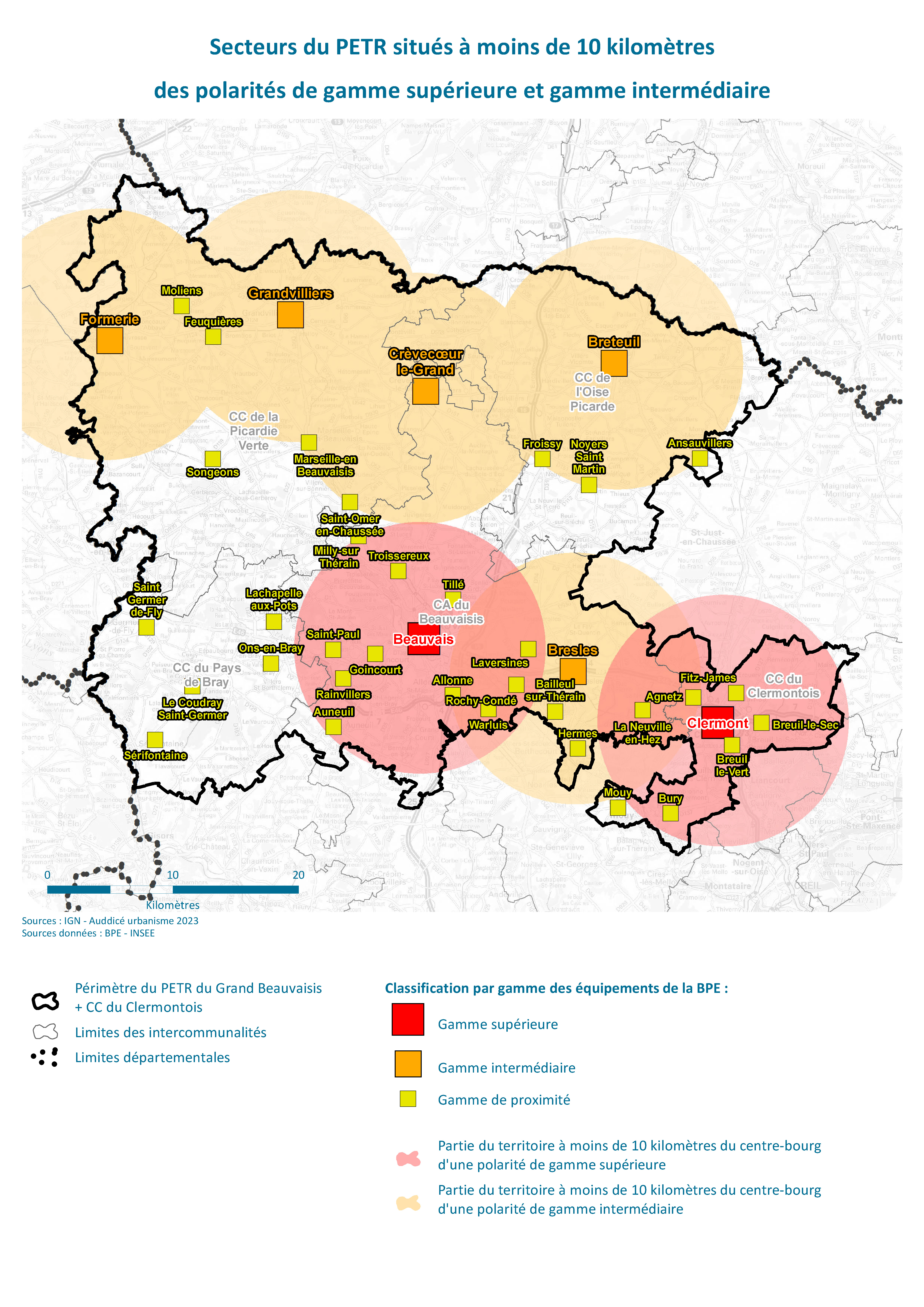 CARTES - Secteurs du PETR situés à moins de 10km des polarités de gamme supérieure et de gamme intermédiaire